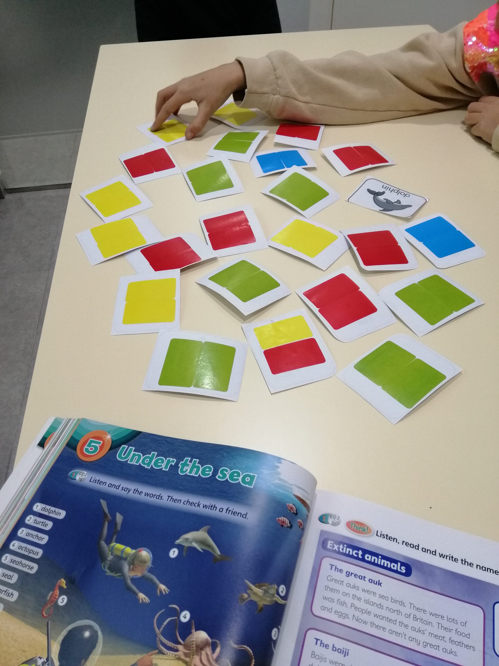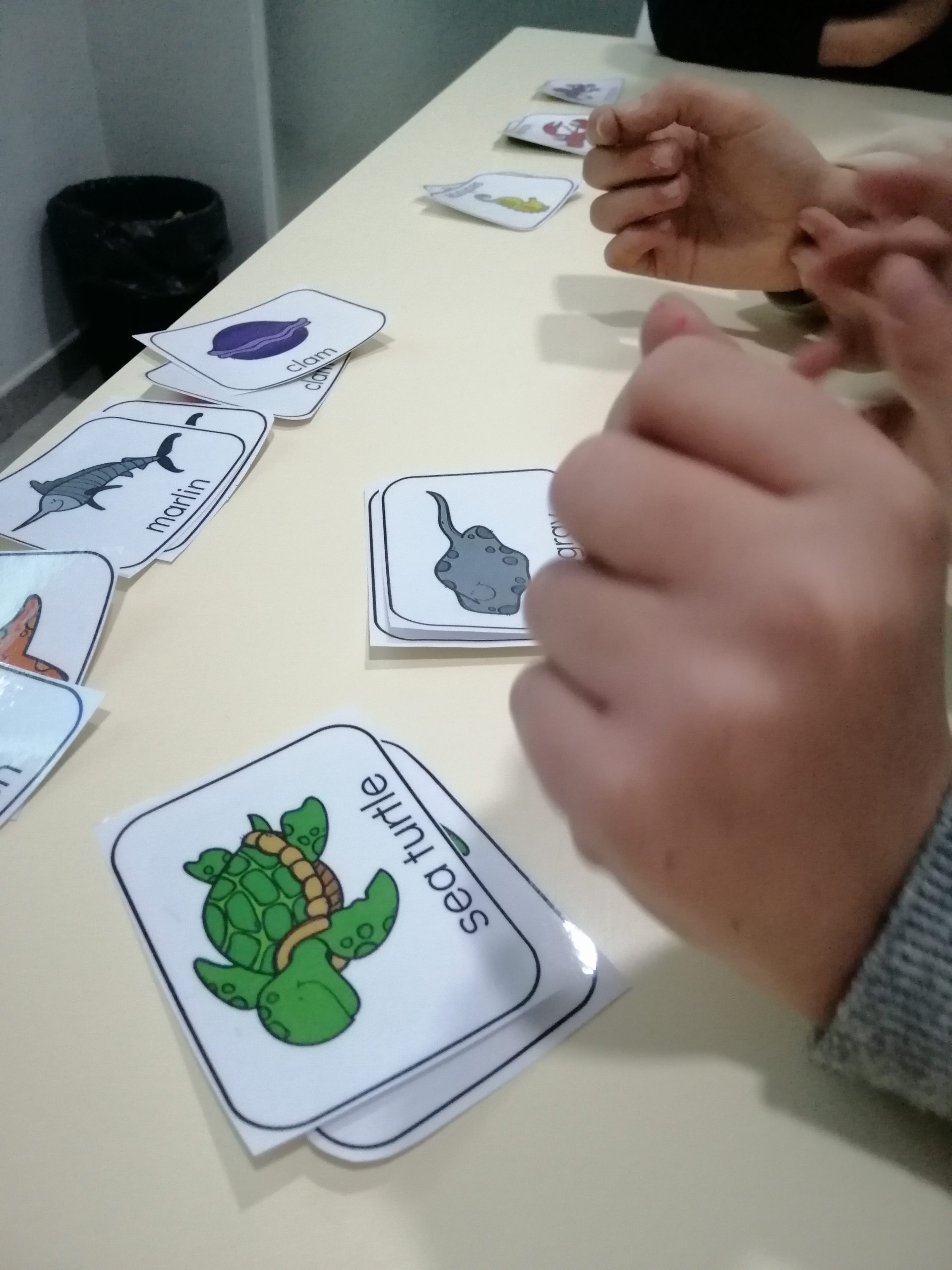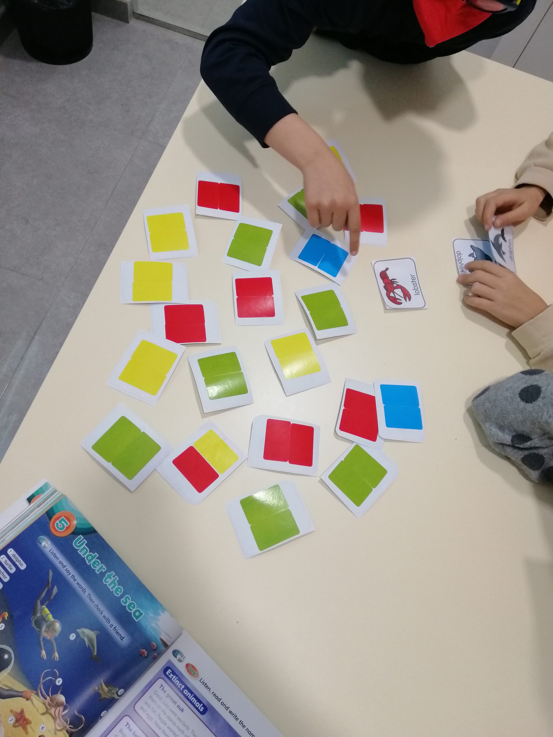 La classe de Kids de la teacher Sara Gómez ha emprès un viatge a les profunditats marines per aprendre nou vocabulari sobre els animals aquàtics. Amb l’ajuda d’un memory, els infants s’han divertit recordant els noms d’aquestes criatures que viuen sota l’aigua amb un dels jocs més clàssics i útils per, com indica el nom, treballar la memòria.
